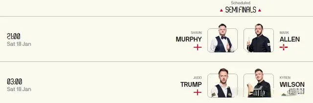 至此,本届大师赛的1/4决赛全部结束,四强正式诞生,半决赛对阵是:上半区肖恩·墨菲VS马克·艾伦、下半区特鲁姆普VS凯伦·威尔逊。根据赛程安排,接下来一个比赛日将进行半决赛,首场半决赛将于1月18日晚上21点打响,由肖恩·墨菲对阵马克·艾伦,第二场半决赛将于1月19日凌晨3点打响,由特鲁姆普VS凯伦·威尔逊。